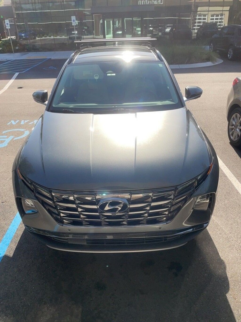 Certified. Amazon Gray 2022 Hyundai Tucson Limited FWD 8-Speed Automatic with SHIFTRONIC 2.5L I4 DGI DOHC 16V LEV3-ULEV70 187hp 4-Wheel Disc Brakes, 8 Speakers, ABS brakes, Apple CarPlay & Android Auto, Auto High-beam Headlights, Automatic temperature control, Brake assist, Bumpers: body-color, Delay-off headlights, Dual front impact airbags, Dual front side impact airbags, Electronic Stability Control, Emergency communication system: Blue Link Connected Car Service (3-year complimentary subscription), Four wheel independent suspension, Front anti-roll bar, Front Bucket Seats, Front Center Armrest, Front dual zone A/C, Front reading lights, Fully automatic headlights, Garage door transmitter: HomeLink, Heated & Ventilated Front Bucket Seats, Heated front seats, Heated rear seats, Heated steering wheel, Illuminated entry, Leather Seat Trim, Low tire pressure warning, Memory seat, Navigation System, Occupant sensing airbag, Option Group 01, Outside temperature display, Overhead airbag, Overhead console, Power Liftgate, Power moonroof, Power passenger seat, Power windows, Radio: Bose Premium w/AM/FM/HD/SiriusXM Audio System, Rain sensing wipers, Rear anti-roll bar, Rear reading lights, Rear seat center armrest, Rear window wiper, Remote keyless entry, Roof Rack Cross Rails, Roof rack: rails only, Speed control, Split folding rear seat, Steering wheel mounted audio controls, Tachometer, Telescoping steering wheel, Tilt steering wheel, Traction control, Turn signal indicator mirrors, Variably intermittent wipers, Ventilated front seats, Wheels: 19" x 7.5J" Machine-Face Finish Alloy.